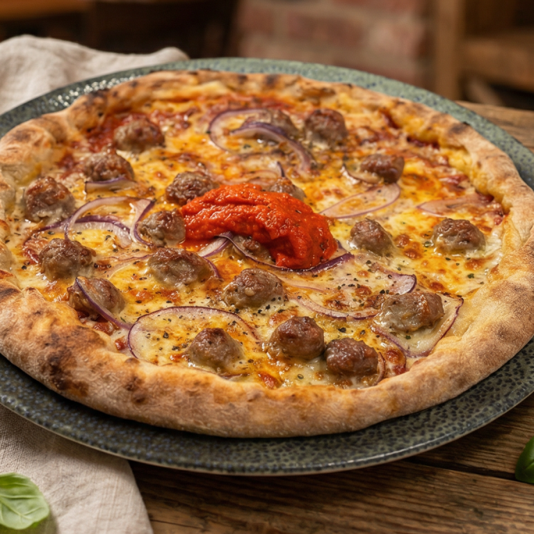 Tomatensoße / Mozzarella / Ćevapčići / Ajvar / Zwiebel