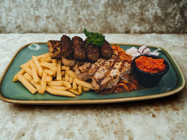 4 gegrillte Ćevapčići / 1 Schweine-Ražnjić / Djuvecreis / Pommes / Zwiebel / Ajvar