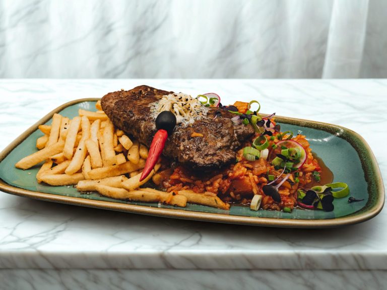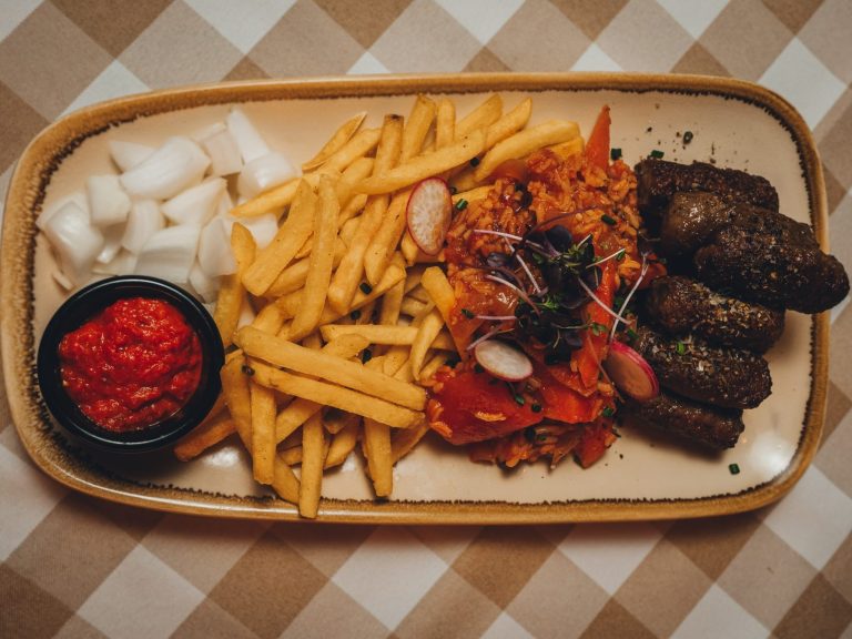 Aus Kalb- und Rindfleisch / Djuvecreis / Pommes / Zwiebel / Ajvar